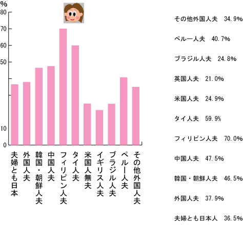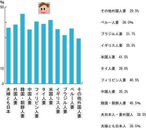 | 妻の国籍別離婚率と傾向 国際結婚したい時は、結婚相手の女性の国籍についても考慮しましょう。 1、韓国・朝鮮人女性 45.5% 2、アメリカ人女性 41.5% 3、フィリピン人女性 40.5% 1、ブラジル人女性 31.7% 2、中国人女性 35.3% 3、イギリス人女性 35.5% ・日本人男性はブラジル人女性や中国人女性との離婚率が低くなっています。(日本人同士の離婚率よりもやや低い) ・一方、韓国人女性やアメリカ人女性、フィリピン人女性との国際結婚で比較的離婚率が高くなっています。 |